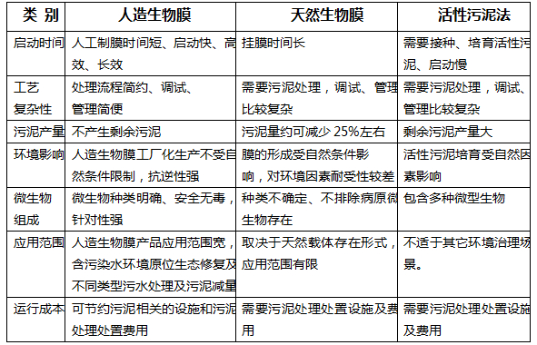 (2)综合比较证明人造生物膜优于天然生物膜和活性污泥法(表2)。 表2.人造生物膜与天然生物膜和活性污泥法的综合比较