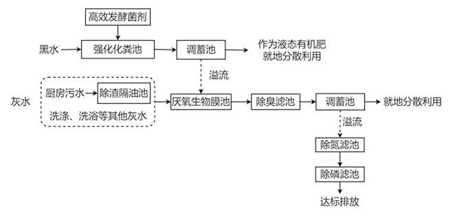 三、项目工艺 污水治理与资源化利用遵循“因地制宜、分质治理、低碳高效、以用促治”的思路,本项目有效衔接农村改厕和污水治理,生活污水黑灰分离,黑水接入强化化粪池,内设填料并投加高效水解菌剂,作为生物强化措施(如下图1所示)。