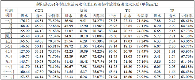 生活污水治理及资源化利用模式图 适用地区:资源化处理模式主要适用于常住人口较少、居住分散,以及具备适宜环境消纳能力的村庄,在按照相关规范标准对粪污无害化处理的基础上,就近就地实现农村生活污水资源化利用。农村生活污水资源化利用可结合村庄布局和地形条件、农村产业结构、气候环境条件、土壤类型、作物种类、生活污水治理要求等,根据不同的利用情景(就地分散利用或尾水集中利用)和收集方式(黑灰分离或混合收集),选择适宜处理工艺,并达到相应标准要求,实现农村生活污水有效安全的资源化利用。 四、运行情况 1.建设内容与进展 分散生活污水处理设施建设:按照项目计划,2024年初分散生活污水处理设施1200户的建设工作各行政村,根据实际情况,已完成设施的选址、施工及安装调试工作。 集中生活污水处理站点资源化改造:对39个已建的集中生活污水处理站点进行资源化改造,提升处理效率和出水水质。改造工作已全面完成并投入运行,采用了“厌氧+生物吸附滤池”等先进工艺,有效提升了污水处理效果和资源化利用水平。 2.治理模式与技术路线 治理模式:结合射阳县实际情况,采用了集中处理后资源化利用、就地分散利用及污水管控等多种治理模式。 技术路线:针对不同治理区域的特点,选择了适宜的处理工艺和技术路线。例如,在集中处理站点采用“厌氧+生物吸附滤池”工艺,在分散处理区域采用“强化化粪池+无动力灰水净化槽”工艺等。 3.运行维护与管理 运行维护机制:建立了“专业维护,统一管理”的运行维护机制,由专业单位负责污水处理设施的日常运维和管理。 管理措施:定期对设施进行巡检、维护和保养,确保设施正常运行。同时,加强对村民的宣传教育,提高村民的环保意识和参与度。 4.出水水质与资源化利用 出水水质:经过处理后的污水达到《农田灌溉水质标准》(GB 5084—2021)或《农村生活污水处理设施水污染物排放标准》(DB 32/3462—2020),满足灌溉或排放要求。以下是该项目点的逐月抽检数据,进水和出水的各项关键指标均符合《农村生活污水处理设施水污染物排放标准》(DB 32/3462—2020)的排放限值。这些数据表明,污水处理设施在去除有机物、氨氮、总氮和总磷方面表现出色且稳定。出水的所有浓度均显著低于排放限值,充分展示了设施的有效性和可靠性。