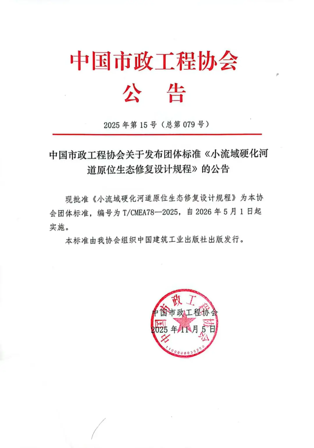 2025年11月5日,团体标准《小流域硬化河道原位生态修复设计规程》(T/CMEA78-2025)经中国市政工程协会批准发布,并将于2026年5月1日起正式实施。 该团标于2023年底由中国市政工程协会正式批准立项。中国科学院城市环境研究所作为标准主编单位,在大量调研和需求分析的基础上,联合相关科研机构与企事业单位进行团标编写工作。该规程对中国村镇小流域硬化河道生态修复过程提出了技术要求,适用于中国村镇小流域硬化河道近自然生态修复的设计、监测与运营维护等方面。该指南的编写既可为科学选择修复技术、优化河流生态修复实施方案提供重要依据,还将对促进全国硬化河道修复的标准化发展起到指导作用。 该标准由中国科学院城市环境研究所、中科环境科技研究院(嘉兴)有限公司、西安建筑科技大学环境与市政工程学院、广西威尔森环保科技开发有限公司、山西交控生态环境股份有限公司、中科嘉辞(昆山)环保科技有限公司、中国社会科学院生态文明研究所、ANSO环境科技产业联盟等单位参与编制。
